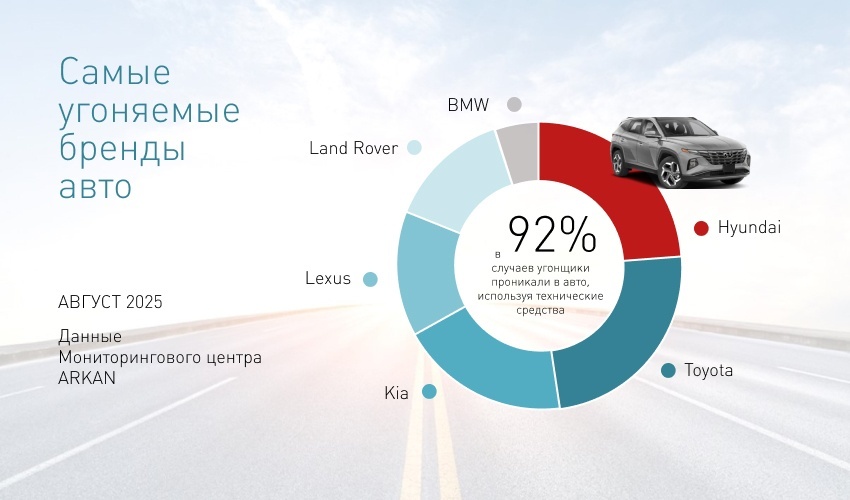 В августе 2025 г. Мониторинговый центр ARKAN зафиксировал 21 попытку угона. В этом месяце Санкт-Петербург занял лидирующую позицию по количеству происшествий – 40% случаев, в Москве – 35% случаев, в других регионах РФ – 25%.
