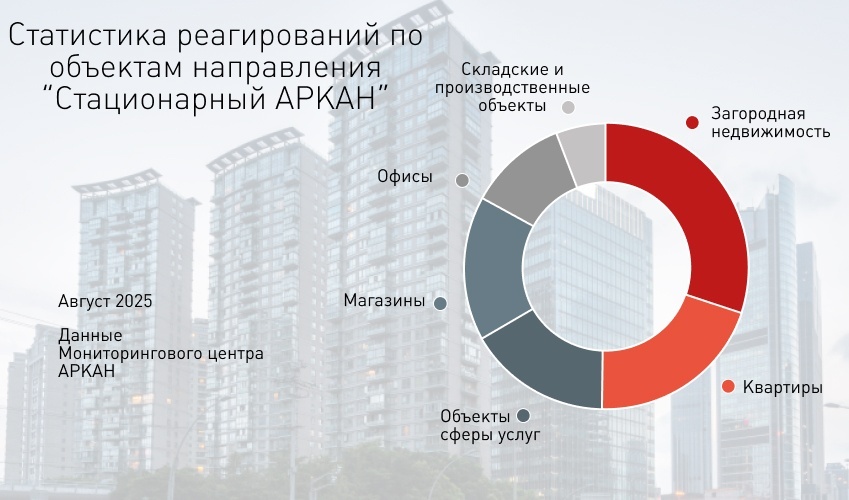 Чаще всего тревоги поступали от загородных объектов недвижимости — 68 инцидентов, на втором месте - городские квартиры — 45 случаев, сфера услуг (рестораны, кафе, салоны, клиники) – 37 тревог, магазины – 35, офисы – 25, складские и производственные объекты – 15.