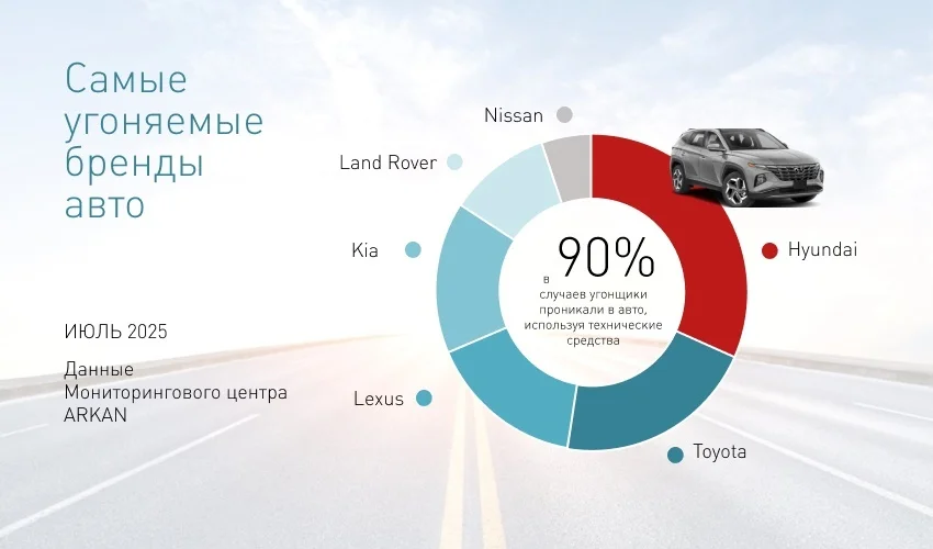 По данным Мониторингового центра АРКАН в июле 2025 года злоумышленники совершили 19 попыток угона, 62% из которых пришлись на Санкт-Петербург, 27% произошли в Москве, а оставшиеся 11% были совершены в регионах.