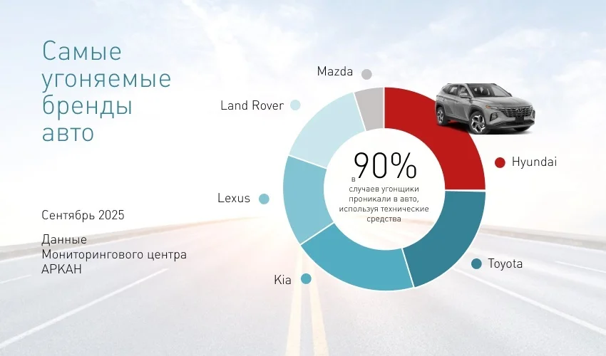 Для проникновения в автомобиль в 90% случаев угонщики использовали технические средства сканирования штатной сигнализации и ретрансляцию сигнала. Всего за сентябрь 2025 г. Мониторинговым центром ARKAN оперативно отработано 69 058 тревог от охраняемых мобильных объектов. Все автомобили остались с владельцами благодаря охранным системам ARKAN.